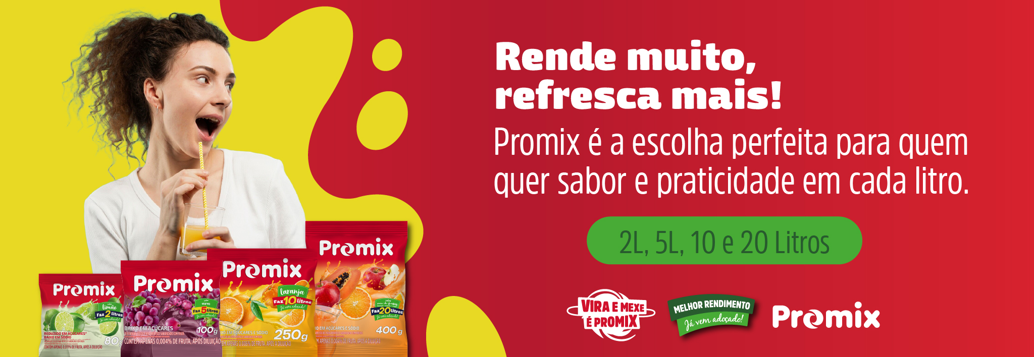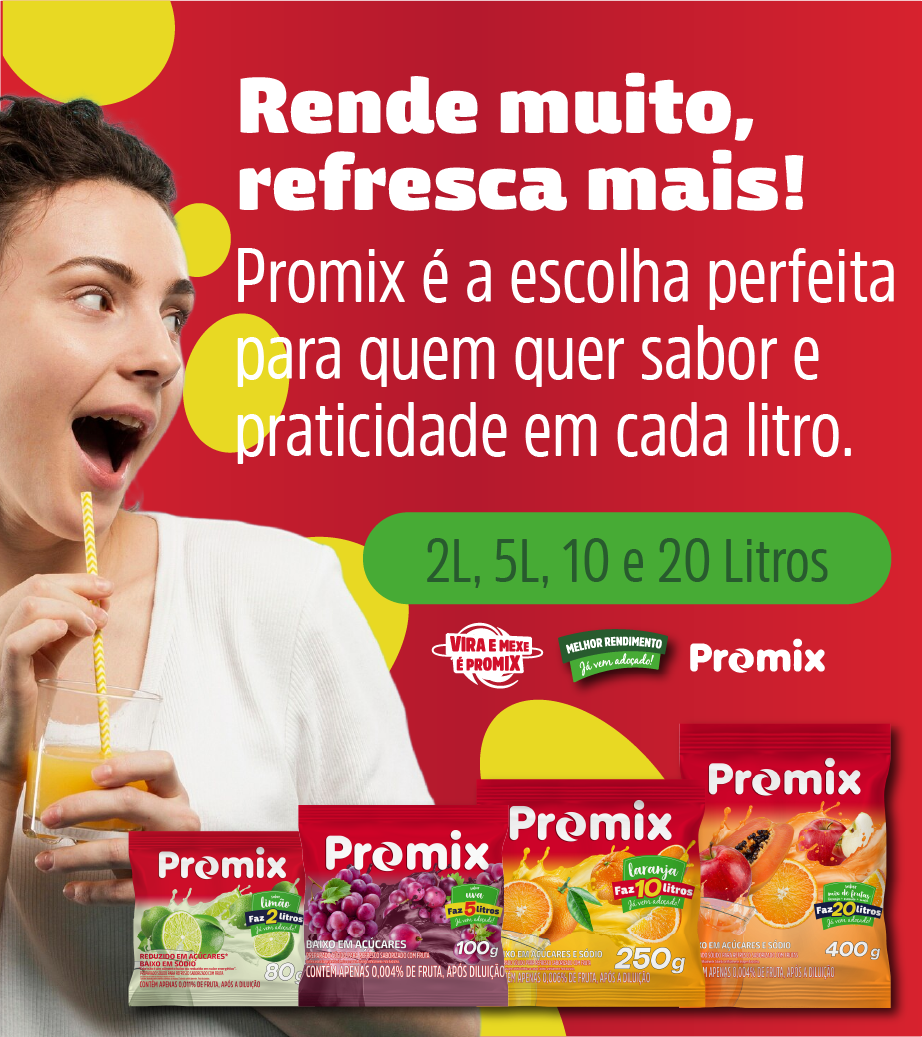 Os refrescos Promix são fontes de vitamina C, tem o melhor custo-benefício da categoria, são práticos e de fácil dissolução. Eles podem ser encontrados em 4 versões de rendimento, 2, 5, 10 e 20 litros e em 10 sabores diferentes. Nossos refrescos em pó são deliciosos puros ou em combinações incríveis de 2 ou mais sabores, podem ser preparados com leite e até usados em receitas como mouses e outras sobremesas.
